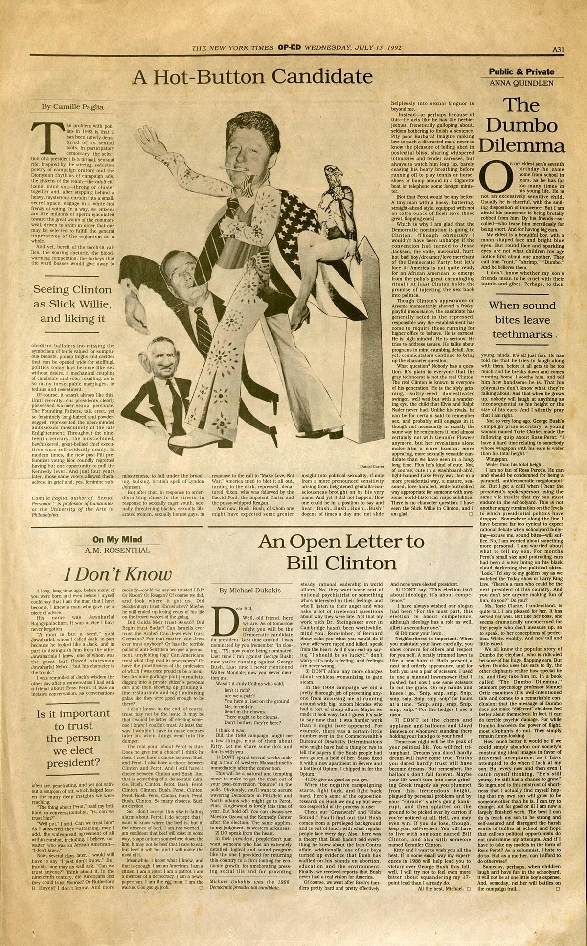 The other Op-Eds parody a trio of familiar Times types: the Highly-Credentialed Has-Been (played here by Michael Dukakis), the Concerned Empathizer (Anna Quindlen), and the Gadfly Intellectual (Camille Paglia). All three are aped precisely and, in the Paglia take on Bill Clinton’s sex appeal, exuberantly: “In a way, we citizens are like millions of sperm ejaculated toward the great womb of the commonweal, driven to swim in order that one may be selected to fulfill the general imperatives of the organism as a whole,” runs a typical sentence in “A Hot-Button Candidate.”
