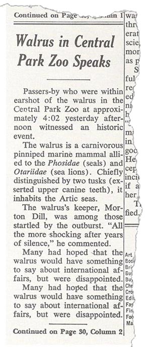 Fifty years ago today, on March 7, 1968, the Harvard Lampoon pulled off one of the great college pranks, replacing the 2,000 copies of The New York Times distributed in Cambridge with a year-old paper inside a fake front page. Among the headlines: “Khesanh Airlift Proves Mistake,” “Governor Warns of Water Surplus,” “Ancient Parthenon Topples As Quake Rocks Greece.” Only a few items hinted something might be amiss: A one-sentence notice that the Times would begin printing funnies, for instance, or the bland headline, “Walrus in Central Park Zoo Speaks.”