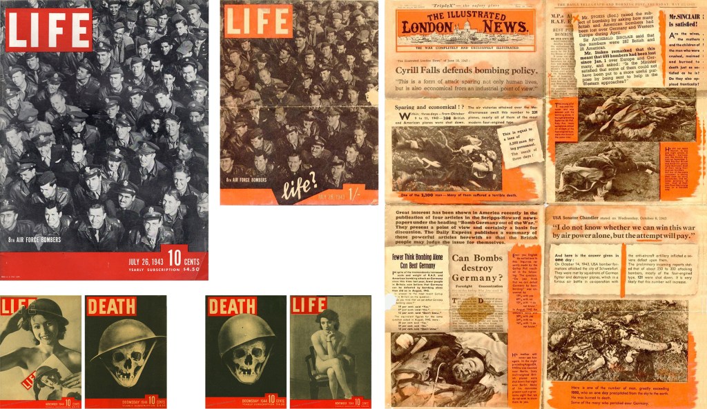The memo didn’t reach German propagandists who dropped an eight-page leaflet/poster on U.S. air bases in East Anglia that same fall. “The front page was an actual reproduction of [the cover of] the true Life issue for July 26, 1943, with pictures of 8th Air Force crews,” R.G. Auckland and Kenneth B. Moore wrote in Messages from the Sky over Britain (London: Psywar Society, 1998), “but the remaining seven pages showed gruesome and horrifying pictures of aircrews who had been killed over Germany, together with many speeches, reports and quotations on the subject of the air bombing of the Third Reich. . . . No mention of the incident appeared in the contemporary national press.” (The whole gory thing can be seen at imgur.com/a/Y2w6u.) A few months after D-Day, postcard-size “Life” covers dated October and November 1944 cropped up in Italy: One one side, a nude woman posed under the familiar logo; on the other, a skull in an army helmet hovered between the red-boxed word “Death” and the date “Doomsday 1944.” At least six different photos were used on the nude side, while the skull alternated between British and American headgear.