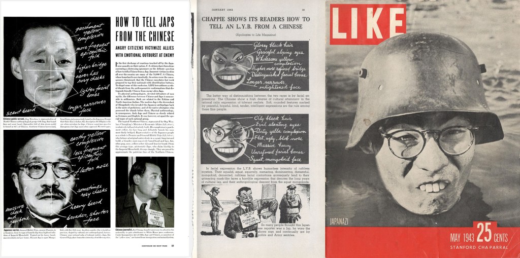 Life’s first issue after the U.S. entered World War II contained one its most embarrassing editorial missteps: a two-page primer on (literal) racial discrimination called “How to Tell Japs From the Chinese” (Dec. 22, 1941). The Stanford Chaparral responded in January 1942, pushing Life’s loaded adjectives and wispy distinctions to absurdity in “How To Tell an L.Y.B. From a Chinese.” Its casual use of racist language to express anti-racist sentiments wouldn’t fly today, but it’s a time capsule of Stanford’s mood in the months between Pearl Harbor and the internment orders, when a thirst for vengeance against Japan mixed with concern for the feelings and safety of Japanese-American fellow students (of whom there were around 30 at Stanford in 1941-42). Significantly, though the issue is called the “L.Y.B. Number,” the phrase “little yellow bastards” never appears, and the writing steers away from the kind of vituperation mocked in “How To Tell… .” (The cartoons are a different story, as usual.)