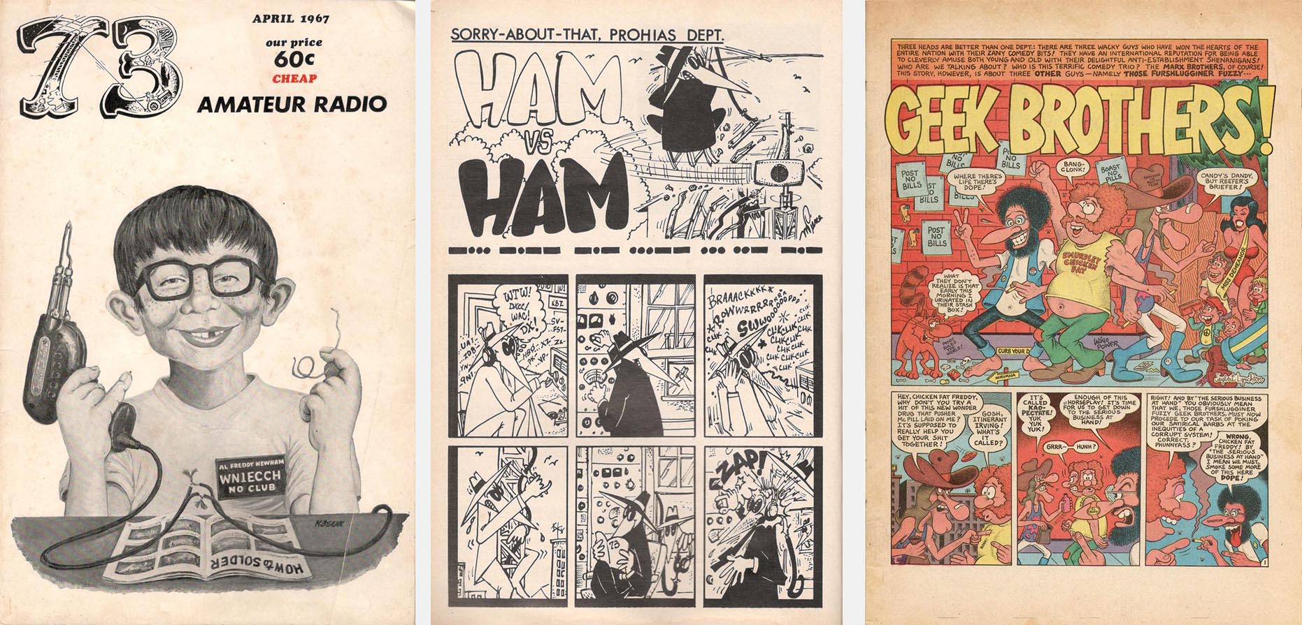 Sometimes, kids who fall in love with Mad grow into adults with access to printing presses; the results can turn up anywhere from porn mags to earnings reports. In 1967, Wayne Pierce drew an Alfred E. Neuman cover and “Ham vs. Ham” for the amateur radio monthly, 73. (The title is short-wave for “Best Regards.”) R. Crumb, Bill Griffith and other heavyweights mocked each other’s creations in the eighth and final issue of Bijou Funnies in the spirit of Mad comics. Editor Jay Lynch wrote an EC-style anti-censorship editorial and parodied Gilbert Shelton’s Fabulous Furry Freak Brothers. The cover was drawn by fabulous though not furry Harvey Kurtzman, who started the whole thing.