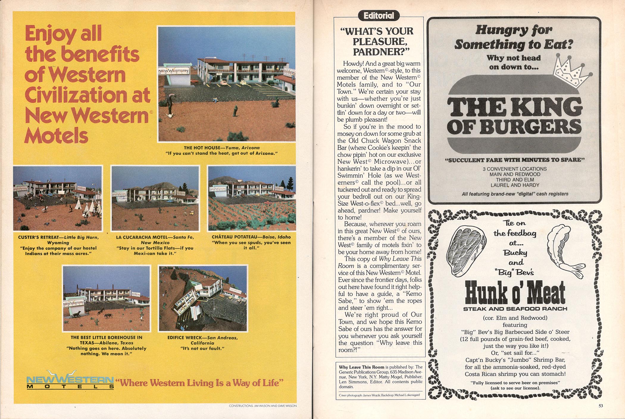 So instead of dwelling on disasters real or parodic, here’s some first aid for folks suffering from cabin fever. National Lampoon’s “Why Leave This Room?” purports to be “A Complimentary Guide to Local Places, Events, and Happenings” courtesy of “New Western Motels,” though exactly which locality is unstated. Like many early-’80s NL spoofs, it’s funny but one-note: Every “attraction” in the surrounding hellscape is either mind-numbingly generic or flat-out deranged — a sure cure for wanderlust. So if the itch to go out is rising, read these five pages. Pretend they describe the world outside your current bunker. Then ask yourself, “Why Leave This Room?” — VCR